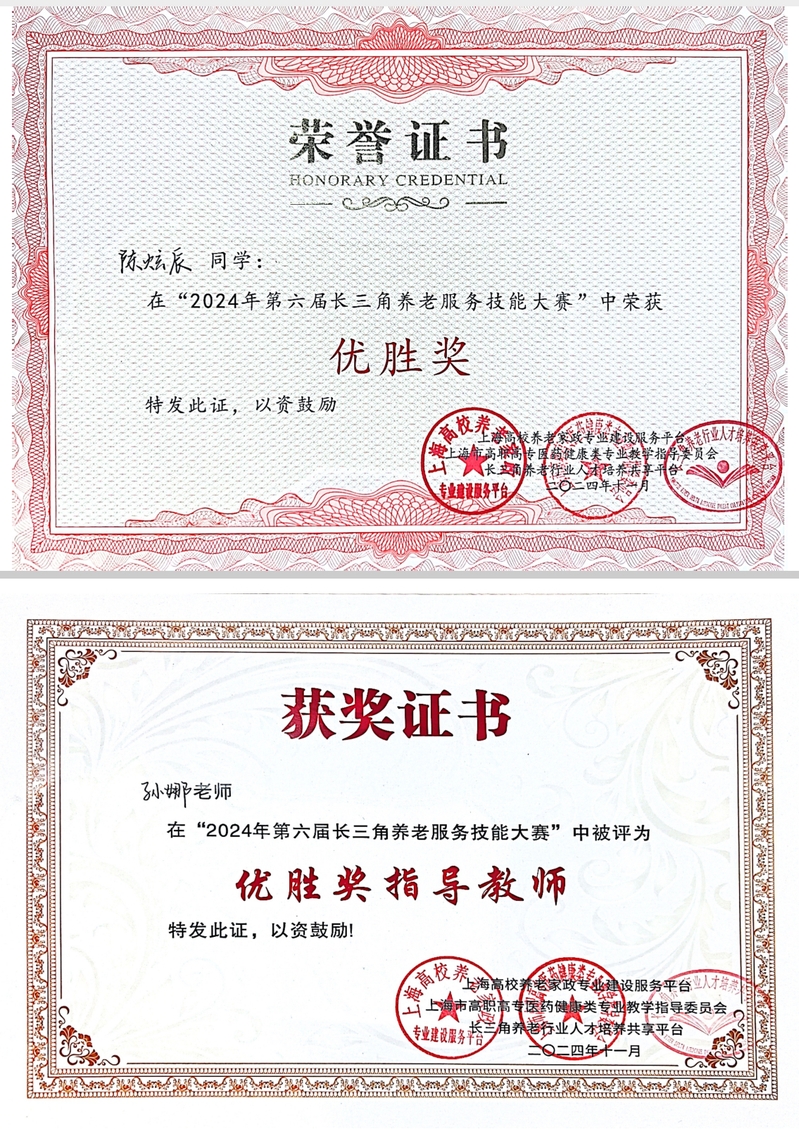 在第六届长三角养老服务技能大赛中,我校公共卫生与护理学院陈莎同学荣获三等奖,陈炫辰同学荣获优胜奖。