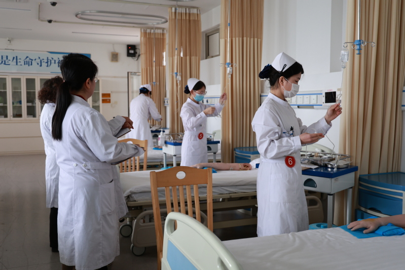 参赛选手按照抽签顺序,依次进行自我介绍、核对医嘱、评估病人与环境、进行手部消毒并佩戴口罩等流程,随后回到治疗室,将治疗车推至病房进行输液,输液结束后核对信息拔针,并整理记录。选手们为病人进行注射时亲切的问候,动作规范、技术娴熟、严格做到“三查八对”,与患者保持了良好的沟通。