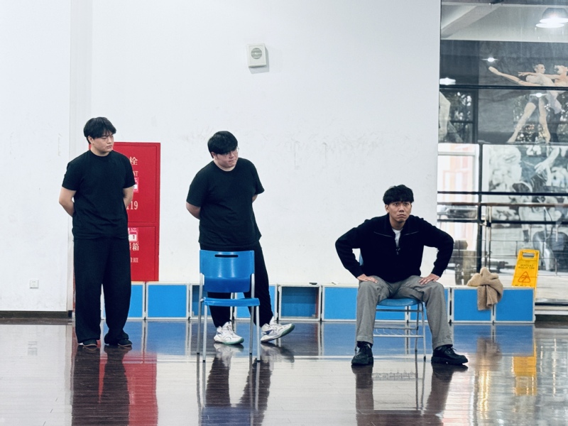 在“物理行动的记忆”课程中,佘慕杰老师通过“行动链条”训练法,要求学生将日常动作拆解为连贯的物理行为,培养精准的肢体控制力。在“哑剧”课程中,学生仅凭肢体完成角色塑造,挑战无声表演的张力与感染力。学生们通过分组创作无台词片段,用夸张的肢体语言诠释现代人的孤独与渴望,引发强烈共鸣。