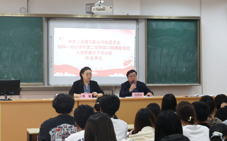 2025年4月16日下午,上海震旦职业学院第三十三期高级党校入党积极分子培训班结业典礼在教学楼1-209室举行。党委副书记黄敏、党委组织部副部长(主持工作)翁昊年、各二级学院党总支书记以及第三十三期高级党校全体学员参加了典礼。典礼由翁昊年主持。