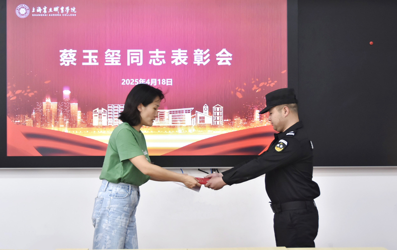 表彰会上,董事长张沈向蔡玉玺所在的英佩设施管理服务有限公司递交了表扬信,信中对蔡玉玺高度负责的工作态度给予了充分肯定和赞扬,随后为蔡玉玺颁发了“校园安全卫士”奖状和奖金。