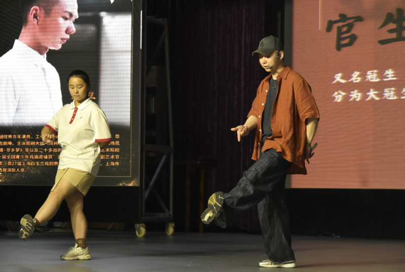 互动环节,卫立老师邀请几位学生上台,亲自指导他们学习昆剧的基本身段和动作。通过互动体验,完成了一次从理论认知到实践体验的艺术熏陶,不仅让在场学生加深了对昆曲的理解,更激发了他们对传统文化的热爱与传承意识。